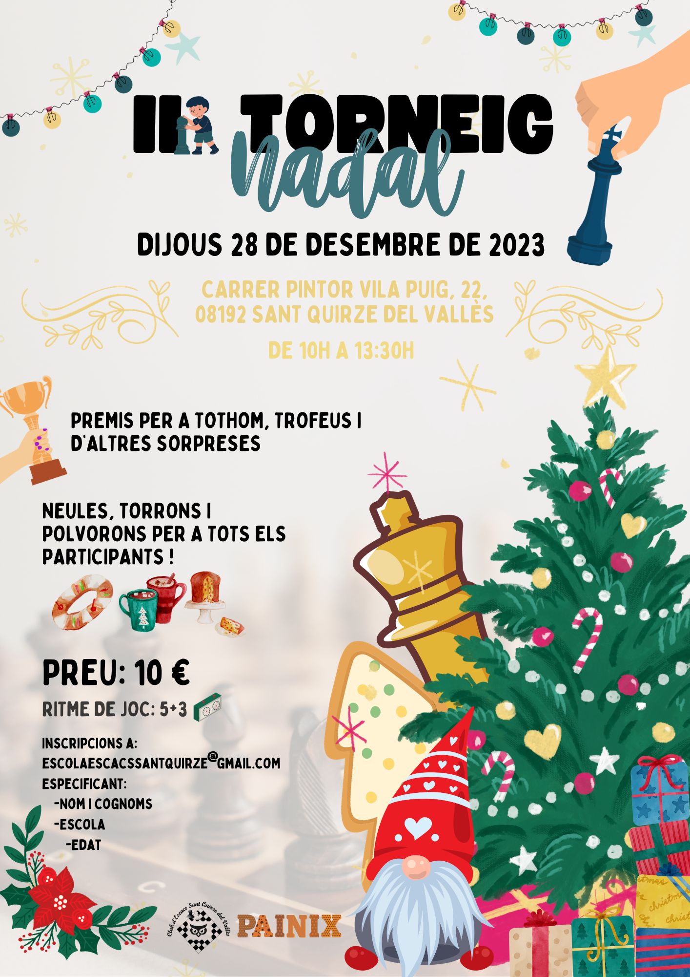 El passat 9 de desembre del 2023 va tenir lloc a Sant Boi el 1r torneig beroamericà de partides ràpides d’escacs. Van participar 150 jugadors amb 14 Grans Mestres. El Club hi ha participat amb tres membres Nil Sakar (10 anys), el profe Marc Torralba i Víctor.